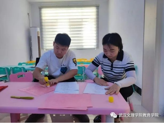 学前教育系夏江南与张澜两位老师正在做演出前准备,老师们互相协调,配合默契。