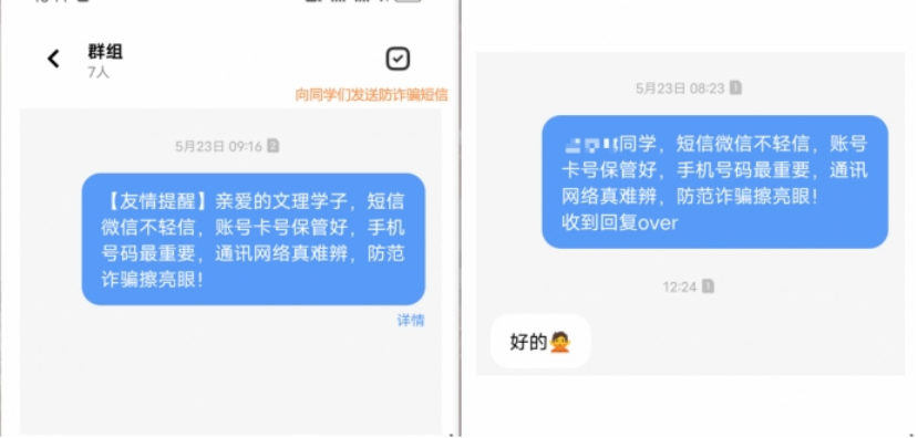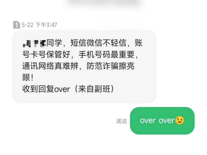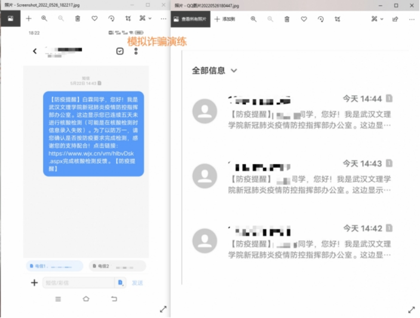 为了测试学子们的防诈骗意识,必威西汉姆官网平台开展了“诈骗演习”,模拟骗子的诈骗手法,随机给同学们发送诈骗短信。