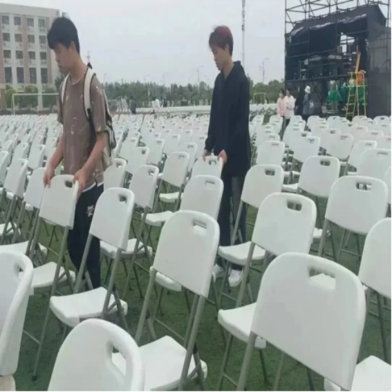 在活动结束后认真清理现场,收回椅子。夜幕降临,星光闪烁,他们在第一时间将300把椅子收回体育馆。微微晚风吹拂他们满是汗水的前额,只为共创文理的美好。