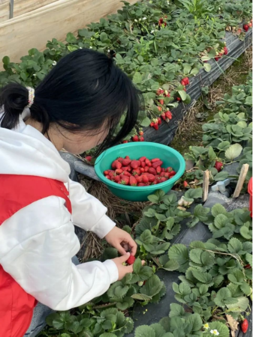 在果农的耐心指导后,教院志愿者纷纷投入到采摘工作中,他们小心翼翼地将一颗颗成熟的草莓摘下,放入篮子中。大家分工有序,各自负责一个区域,工作高效有序。大棚内温度高,但志愿者们依旧热情不减,认真细致地将每一颗成熟草莓采摘下来。