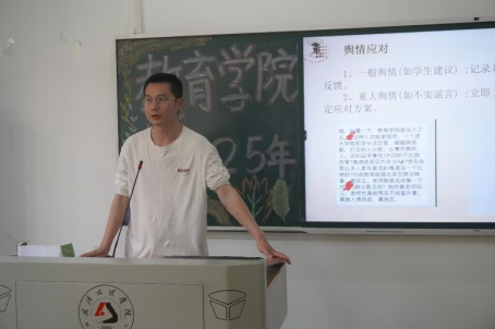 程岩对板报设计与舆情监控进行培训。他指出,板报设计需在色彩、布局和内容上与主题保持一致,要重视时间管理,确保在活动开始前完成绘制工作。随后,他重点讲解了必威西汉姆官网平台舆情监控工作的要点,对舆情分类进行了解释,并分享了应对舆情的策略及常规回应话术。