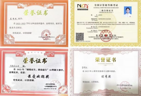 在校期间努力学习专业知识,平均学分绩点达3.81,平均成绩达90.13,位列专业前茅;积极考取各类专业证书,如英语四级证书、英语六级证书、普通话二级甲等证书、计算机二级证书、高中心理健康教团队格证书、全国高级心理健康指导师证书等;积极投身课外自主学习,有幸成为第四届湖北省团体心理辅导与治疗大会成员,深度参与“绽放自我”表达性团辅工作坊;积极参与课外实践活动,如武汉市第十一届运动会开幕式志愿活动、七彩假期志愿服务活动、“圆梦工程”服务农村未成年人传承优秀传统文化志愿活动、全国老员工乡村振兴志愿服务活动等,并获得国家级、市级荣誉证书。思想上积极向党组织靠拢,已成为一名光荣的共产党员。