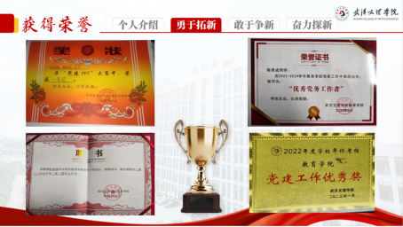 他将积累的经验成果用于实际,代表公司参加“党建PPT大赛”并取得第一名的优异成绩。最终,他凭借工作中的出彩表现荣获“优秀党务工作者”称号,公司也获得了“年度党建工作优秀奖”等荣誉。