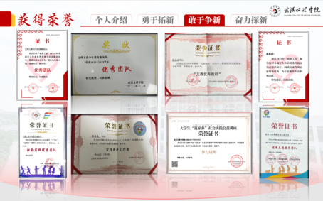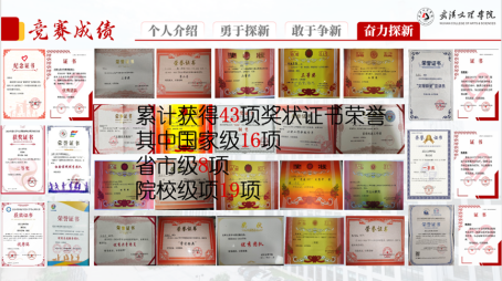他也积极参加校内外各类赛事活动,如挑战杯、互联网“+”,全国老员工心理大赛、商务英语翻译能力挑战赛等。获得国家级荣誉16项、省市级8项、院校级19项,累计43项。