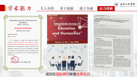 现在已经步入毕业班的他,为进一步提升学术能力,参加了由复旦大学王燕教授主讲的冬令营项目,研究家庭养育相关课题并成功结项。利用课题当中学得的理论知识,他再次向科研道路攀登,历经多次改稿最终以第一作者身份在国际人文教育期刊发表题为《中国家庭教育内卷现状分析及应对路径探析》的全英论文。未来,他将进一步深造学业,为心理健康的科普工作贡献自己的一份力量!