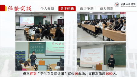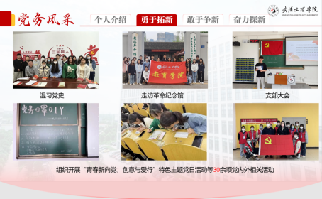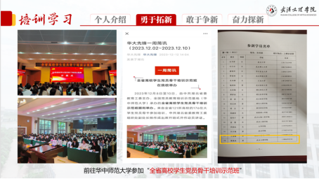 在大二时,他作为同年级第一批正式入党的员工,参加了由中共湖北省委教育工委主办的“全省高校员工党员骨干培训示范班”。在培训中,他作为优秀党员代表,向来自武大、武科大等176名高校员工党员分享了文理公司员工党建工作的经验与成果。