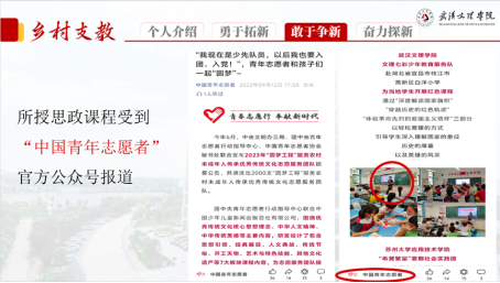 他主授的思政课程被中国青年志愿者官方公众号报道宣传,个人也获得兴山县教育团工委颁发的“优秀支教教师”荣誉。所在团队获评团中央颁发的全国优秀服务团队、校优秀团队等称号。