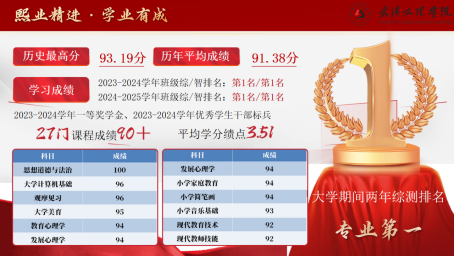 学业上她始终名列前茅,连续两学年稳居专业第一名,综测最高得分93.19分,历年课程平均成绩91.38分,27门课程成绩超90分,平均学分绩点3.51,扎实的学科成绩为专业学习筑牢了核心根基。在专业技能证书的储备上,她精准对标小学教育岗位需求,顺利通过大学英语四级(527分),考取计算机二级证书、普通话水平测试二甲证书,这些技能不仅是专业能力的具象体现,更让她在教育实践场景中具备了更强的适配性。