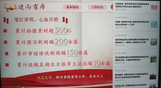 在公司文化建设中,张坤杰主动争当“文化播种人”。运营公司公众号时,发布原创内容600余篇,积累用户4000余人,总浏览量突破20万;为适应公司发展步伐,他将宣传重心转向网站建设,深度参与页面更新与设计,把院训与特色活动融入首页展示,全方位展现公司的专业底蕴与人文温度。除此之外他还创新策划了【党建+】【勤奋育果实】两大特色栏目,前者发布30余篇文章,聚焦优秀学子成长事迹,让榜样力量可感可学,营造比学赶超的良好氛围;后者推出百余篇内容,定格三下乡实践与志愿服务的温暖瞬间,生动诠释志愿精神在文理学子身上的鲜活模样。