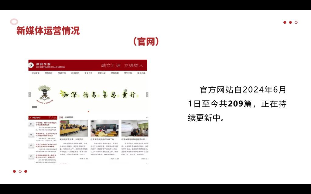 宣传部在各各平台积极宣传获得显著成果,公众号“必威西汉姆官网平台”2024年6月1日至2024年11月14日共计发布公众号617篇,粉丝数达3971人。官方QQ“必威西汉姆官网平台”2024年6月1日至2024年1月17日共计发布918篇,浏览量达28万人次。官方抖音“教小育”2024年6月5日至今共发布作品138篇,获赞8054,粉丝人数589,总浏览量54万。官方网站自2024年6月1日至今共209篇,正在持续更新中。