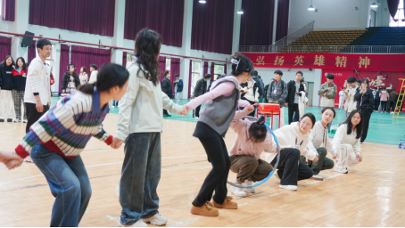 在团队项目中,他们同心协力,凝聚集体合力。在考验技巧与耐心的“筷子夹球”与“摸石头过河”项目中,教师们沉着冷静,稳扎稳打,将教学中的专注与细致体现得淋漓尽致;在需要高度默契的“穿越呼啦圈”和“快乐毛毛虫”竞赛中,队伍节奏统一,动作流畅,衔接自如;而在需要力量与意志角逐的“14人拔河”与“气排球”赛场上,队员们众志成城,奋力拼搏,展现出强大的凝聚力。